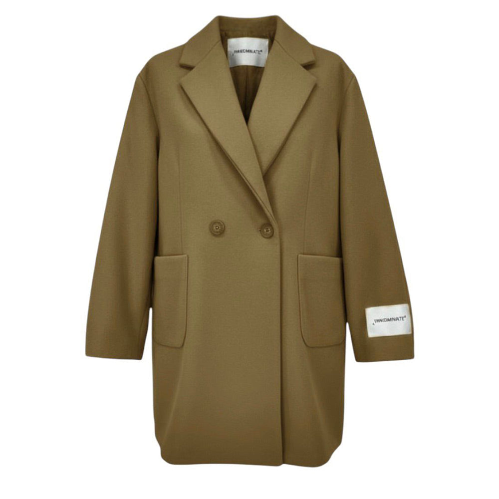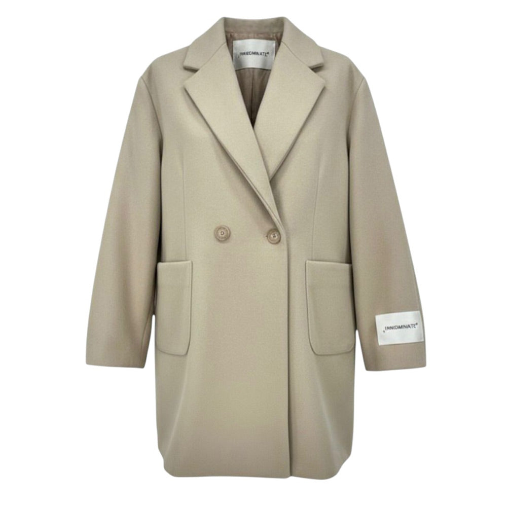 Cappotto doppiopetto in panno, caratterizzato da collo a revers, chiusura frontale con bottoni, maniche lunghe e orlo dritto. È decorato con patch logo applicata sulla manica.