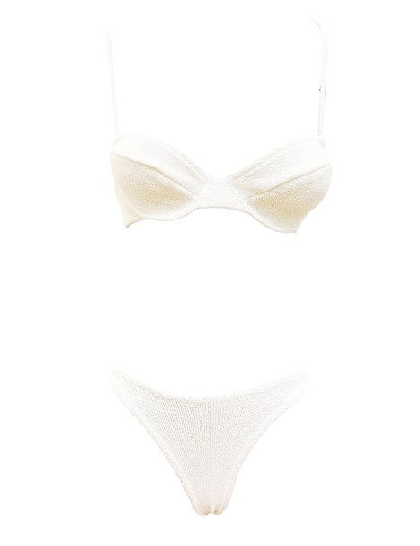 Costume bikini in tessuto elasticizzato goffrato, con slip classico, reggiseno con spalline sottili regolabili, ferretto.