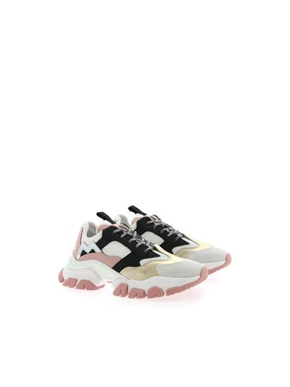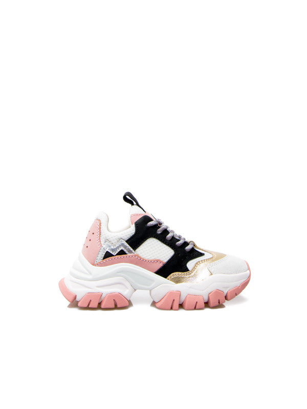 Sneakers Moncler cin inserti in pelle rosa ed oro.
