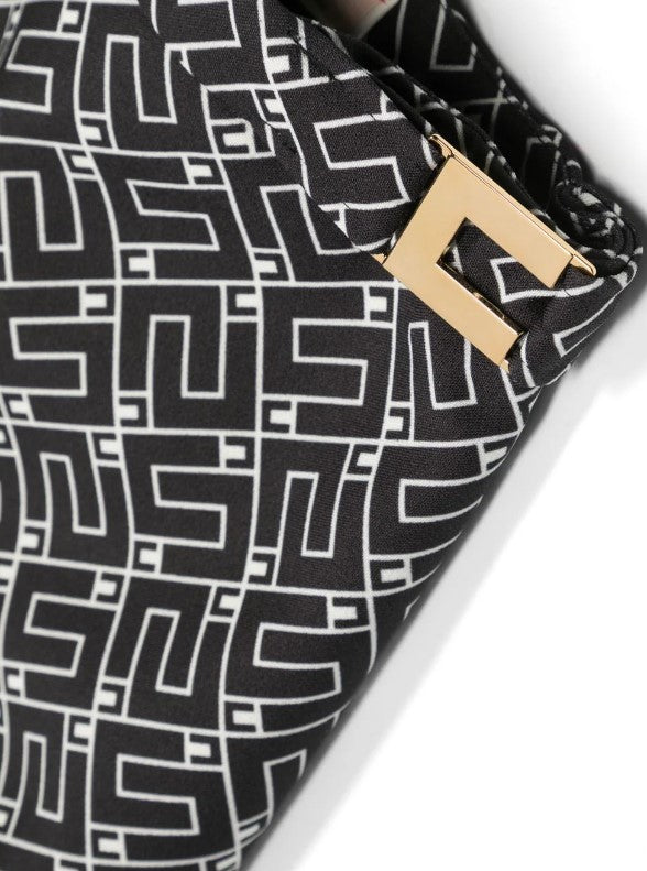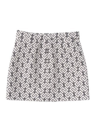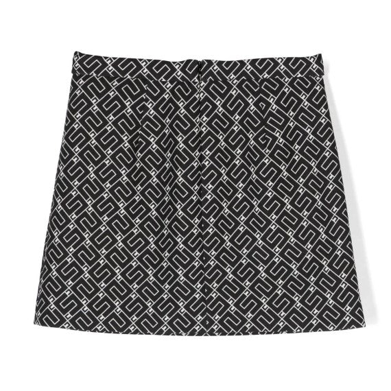 Gonna a tubino, tessuto logato all over, cintura fissa con fibbie in metallo oro, chiusura sul retro con zip.
