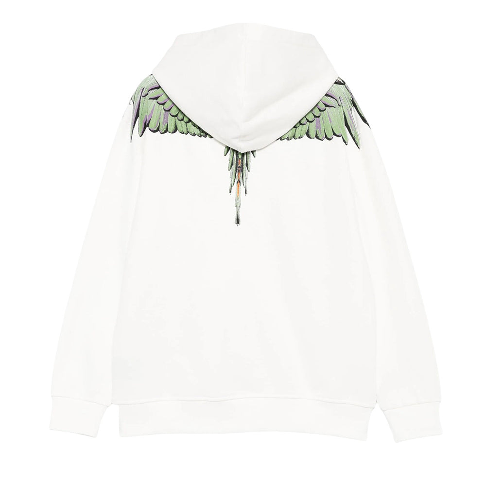 Felpa realizzata in cotone sgarzato, caratterizzata da cappuccio, maniche lunghe, polsi e orlo a coste. È decorata con motivo ali sulle spalle.