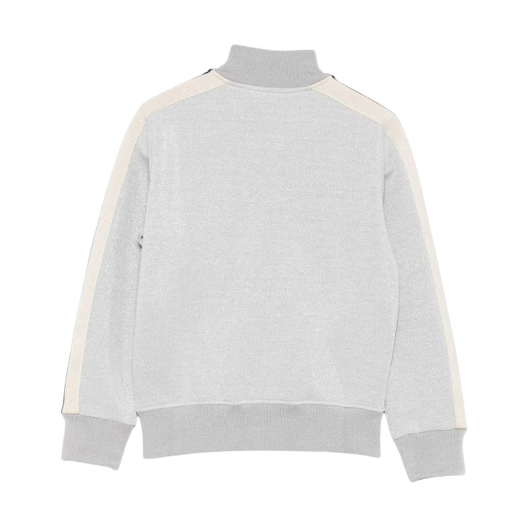 Felpa realizzata in tessuto glitterato, caratterizzata da collo rotondo, chiusura frontale con zip, maniche lunghe con bande in maglia écru, due tasche laterali a filetto e finiture a coste. È decorata con logo ricamato sul petto.