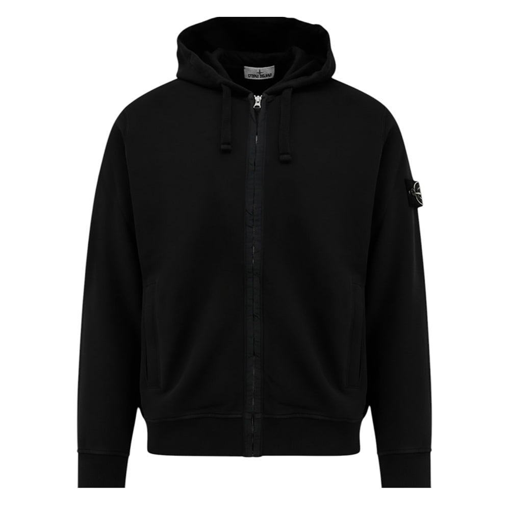 Felpa realizzata in cotone garzato, caratterizzata da cappuccio con coulisse, chiusura frontale con zip, maniche lunghe, due tasche laterali a filetto, fodera in pile, polsi e orlo a coste. È decorata con Badge Stone Island applicata sulla manica.