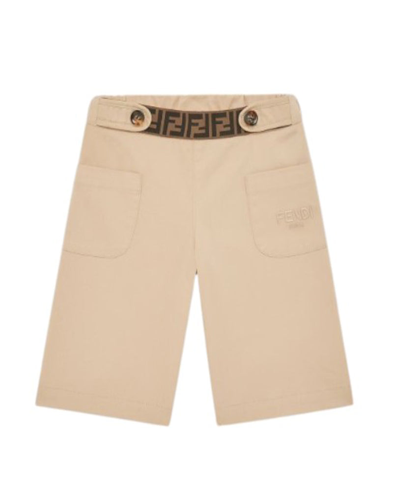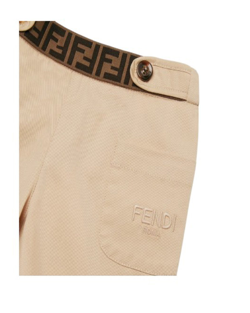 Pantalone baby in gabardina beige con dettaglio in tessuto elastico con logo FF color tabacco sul davanti, due taschine laterali con logo ricamato tone on tone.
