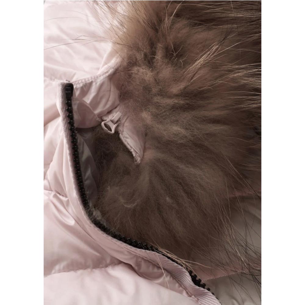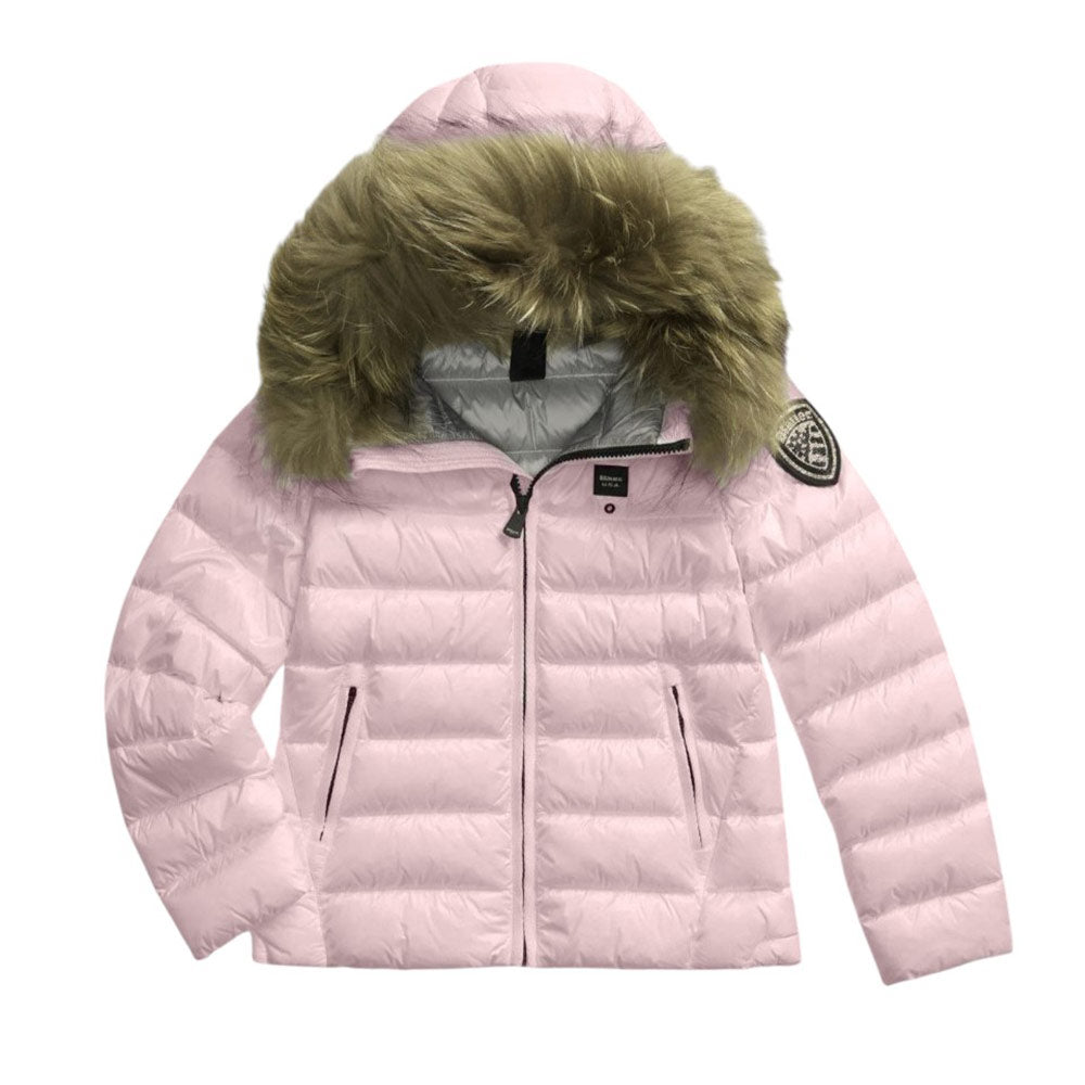 Giubbino Arcadia Junior realizzato in nylon lucido. Presenta design trapuntato a righe orizzontali, imbottitura in piumino 90/10, cappuccio fisso con bordo in vera pelliccia removibile, chiusura frontale con zip nascosta, foderato in nylon a contrasto, maniche lunghe, due tasche laterali con zip. È decorato con patch glitterata (Tg. 8-16 anni) e linguetta con logo.