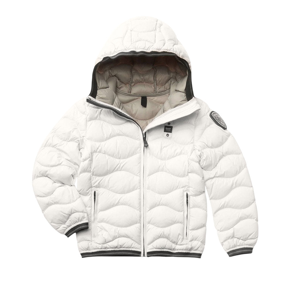 Giubbino Lowell Junior realizzato in nylon lucido. Presenta design trapuntato a onde, imbottitura in piumino 90/10, cappuccio fisso con bordo in elastico rigato, chiusura frontale con zip nascosta, foderato in nylon a contrasto, maniche lunghe con polsi elasticizzati, due tasche laterali con zip e fondo elasticizzato. È decorato con patch glitterata e linguetta con logo.