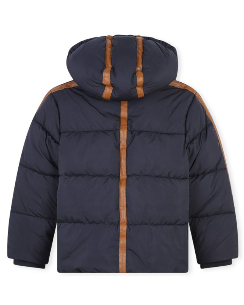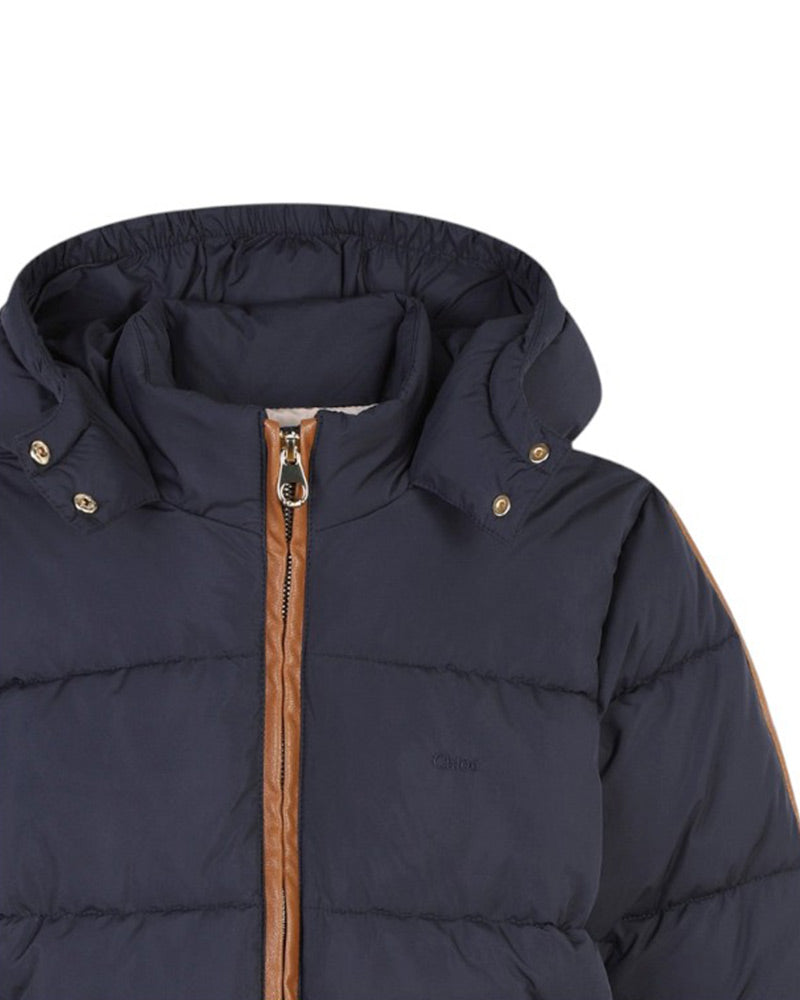 Giubbino imbottito da bambina con dettagli in similpelle. Presenta design trapuntato, cappuccio fisso, maniche lunghe con polsi a costine, chiusura frontale con zip, due tasche frontali a filo. È decorato con logo ricamato sul petto tone on tone.