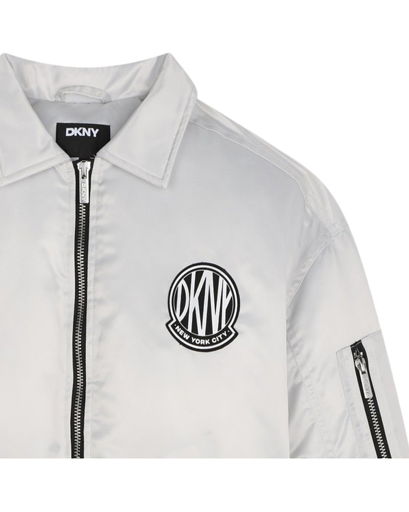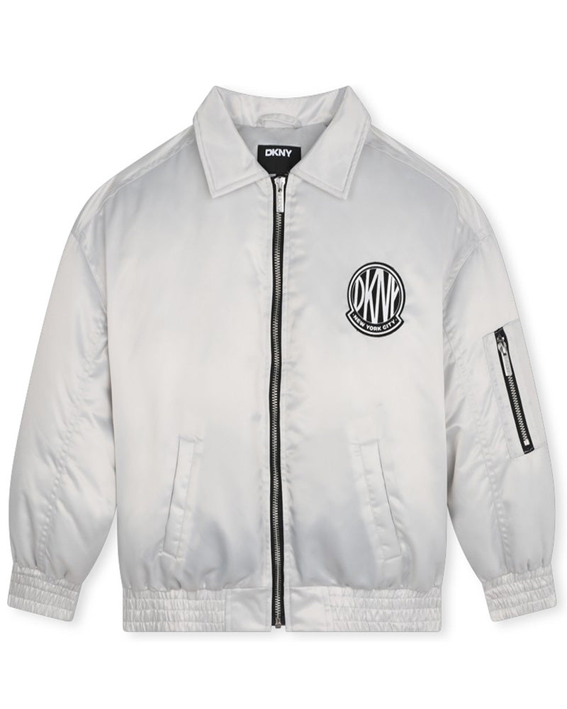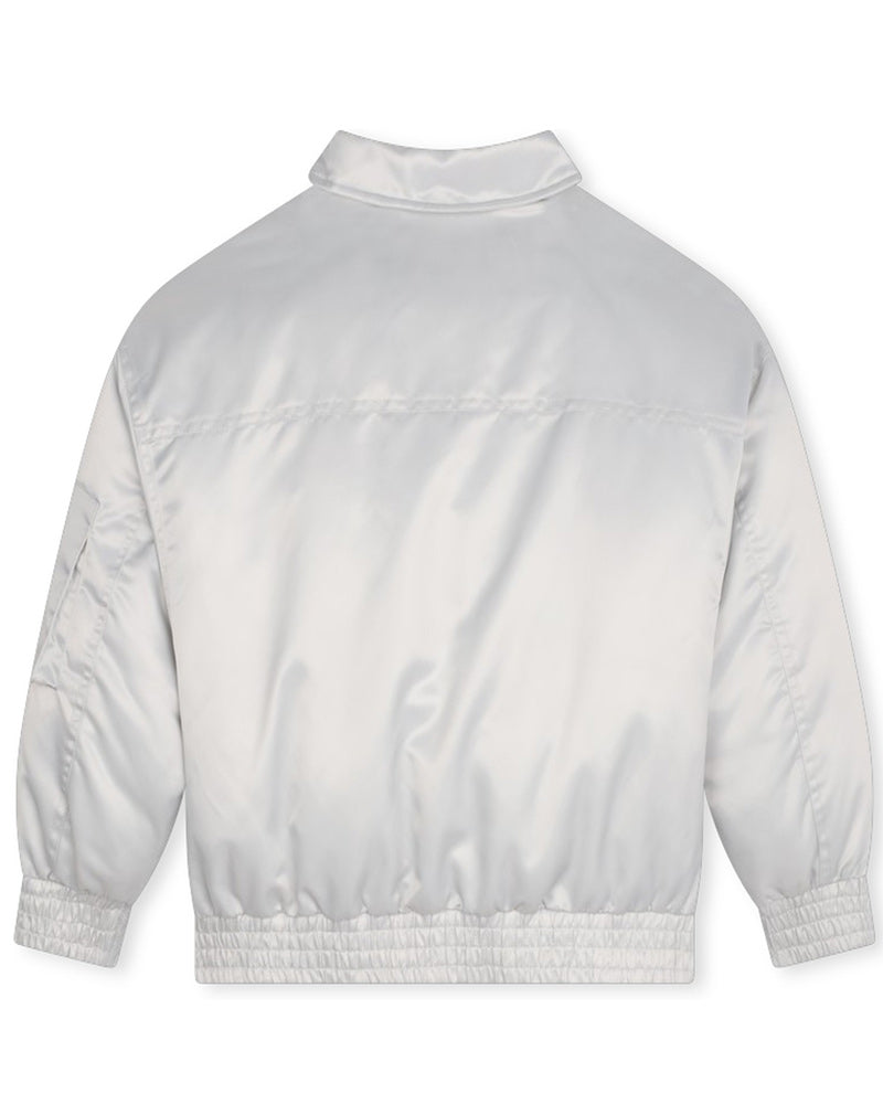 Bomber imbottito da bambina realizzato in nylon lucido. Presenta colletto a punta, chiusura frontale con zip, tasche laterali all'americana, polsi e orlo elasticizzati. È decorato con patch logo in silicone applicata sul petto.