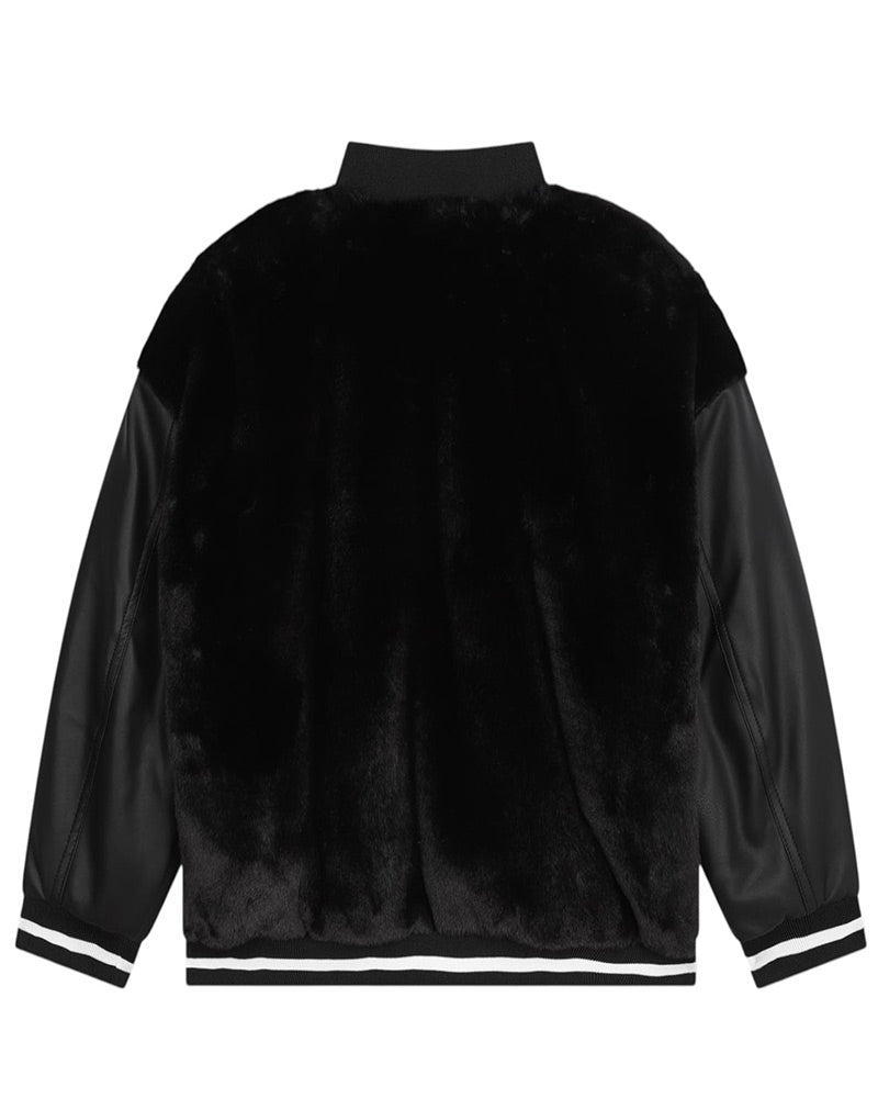 Bomber imbottito bi-tessuto da bambina realizzato in eco-pelliccia e similpelle. Presenta colletto a coste, chiusura frontale con zip, maniche lunghe in similpelle, tasche laterali a filo, finiture a coste. È decorato con patch logo in silicone applicata sul petto.