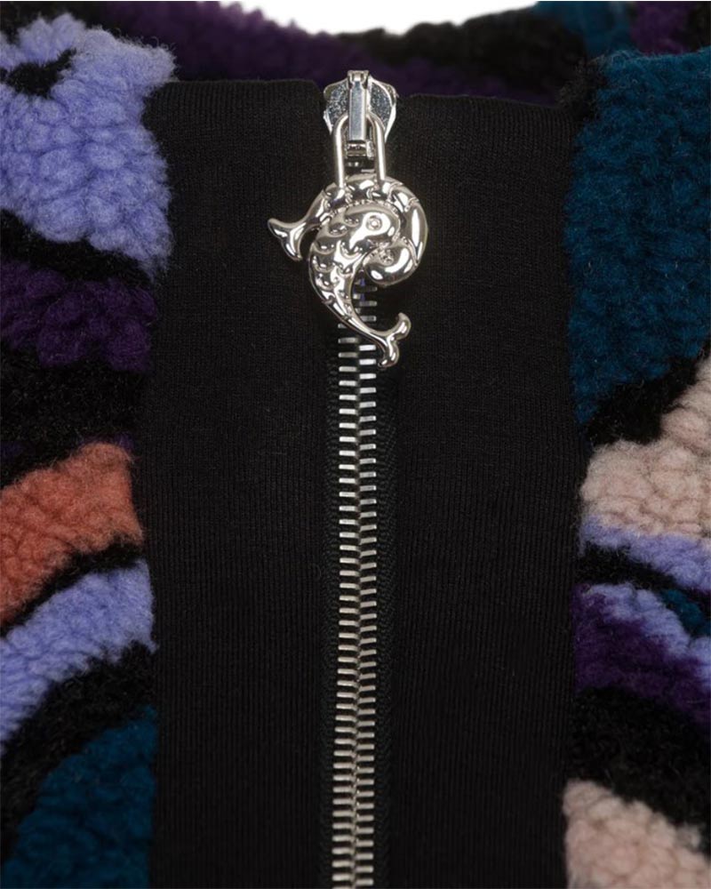 Giubbino multicolor da bambina realizzato in tessuto teddy. Presenta colletto alto, chiusura frontale con zip, maniche lunghe, tasche laterali a filo e orlo dritto.