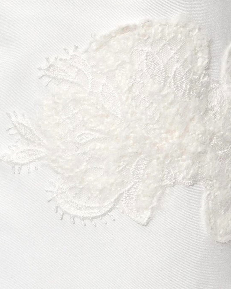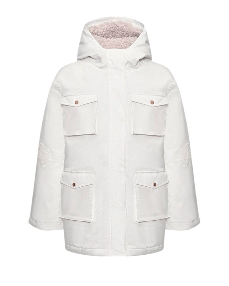 Giubbino avorio con design imbottito da bambina . Presenta cappuccio fisso con fodera in teddy, maniche lunghe, chiusura frontale con zip e bottoni a pressione, quattro tasche con patta applicate sul davanti. È decorato con iconico ricamo dei fiori sulle maniche.