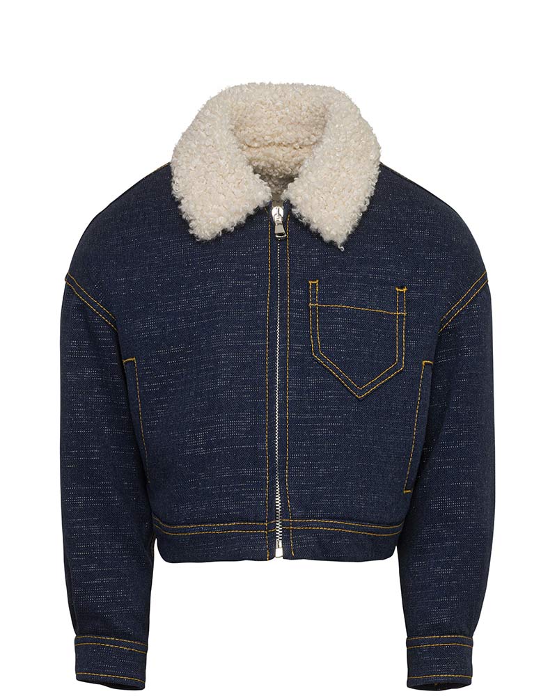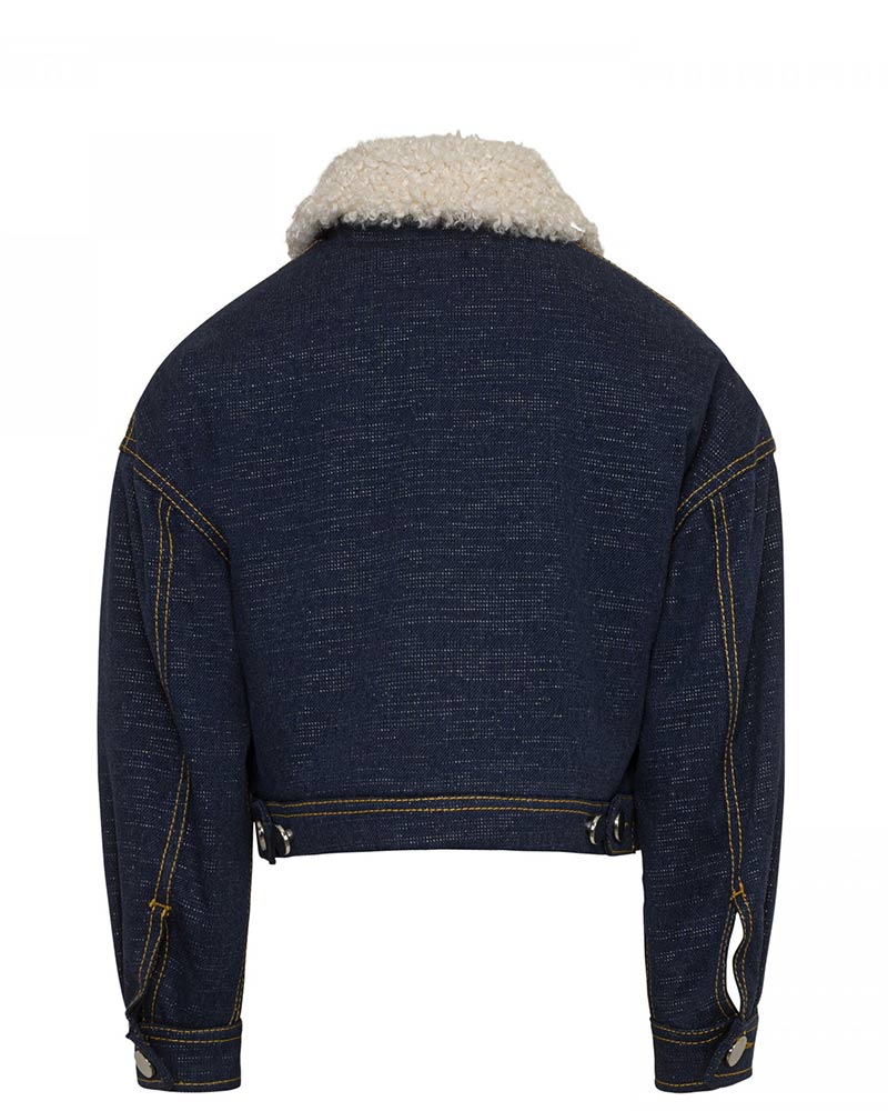 Giubbino imbottito realizzato in denim, con dettagli lurex. Presenta colletto in tessuto teddy, maniche lunghe, chiusura con zip frontale, due tasche a filetto frontali e una sul petto.