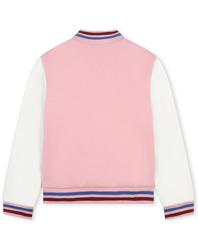 Bomber da bambina modello college, realizzato in panno. Presenta design imbottito, colletto a costine, maniche lunghe, chiusura frontale con bottoni a pressione, tasche laterali all'americana, polsi e orlo a coste. È decorato con logo ricamato sul petto.