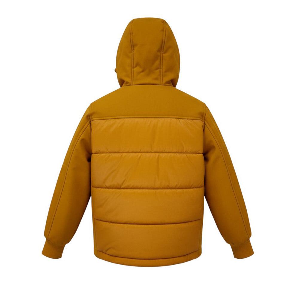 Giubbino realizzato in nylon trapuntato, con inserti in softshell stretch a 3 strati in poliestere multifilamento riciclato. Presenta cappuccio fisso, chiusura frontale con zip, maniche lunghe con polsi a costine, due tasche laterali scaldamani, due tasche applicate con patta sul davanti e orlo dritto con coulisse regolabile. È decorato con lente C.P.Company applicata sulla manica.