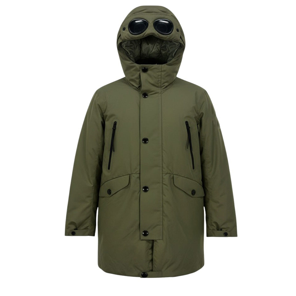 Parka imbottito realizzato in nylon. Presenta cappuccio fisso con lenti Goggle di C.P. Company, chiusura frontale con zip e bottoni a pressione, coulisse interna regolabile, maniche lunghe, due tasche scaldamani con zip e due tasche con patta applicate sul davanti.