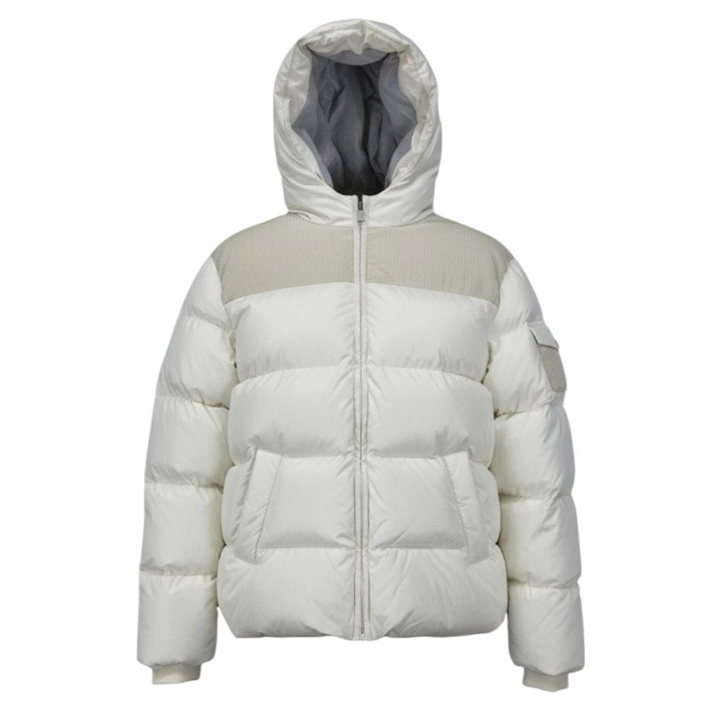 Piumino realizzato in nylon, con inserti in velluto millerighe. Presenta design trapuntato, cappuccio fisso, chiusura frontale con zip, maniche lunghe con polsi a costina, due tasche laterali all'americana e orlo dritto. È decorato con taschino applicato sulla manica.