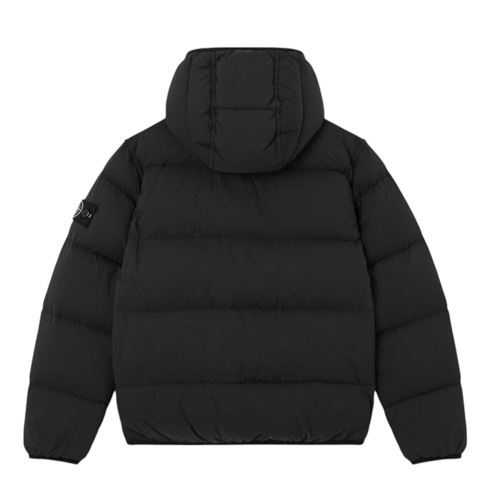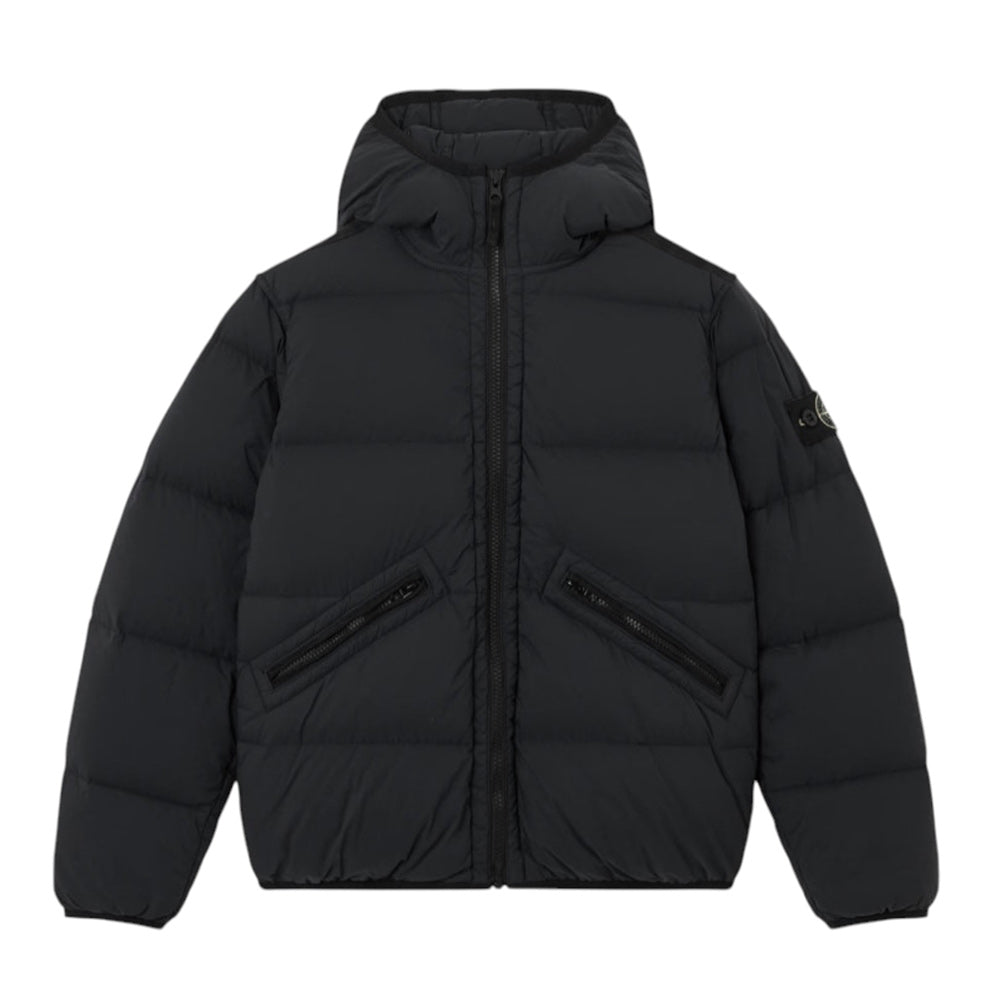 Giubbino imbottito realizzato in nylon, caratterizzato da design trapuntato, cappuccio fisso, maniche lunghe con polsi elasticizzati, chiusura frontale con zip, due tasche laterali con zip e orlo elasticizzato. È decorato con Badge Stone Island applicato sulla manica.
