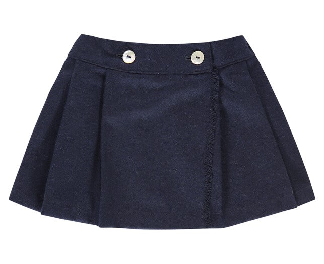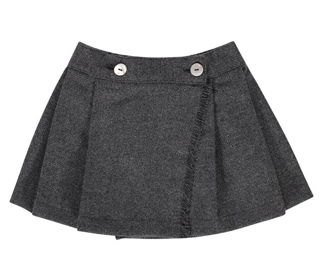 Minigonna a portafoglio in misto lana, con pieghe sul davanti e due bottoncini sul fascione, taglio svasato.