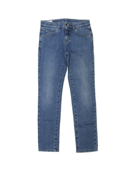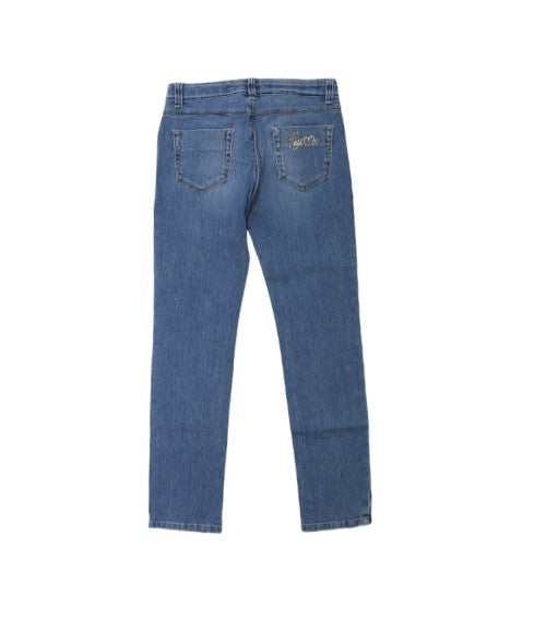 Jeans in denim, modello cinque tasche. Chiusura frontale con bottone e zip. Logo applicato sul taschino posteriore.