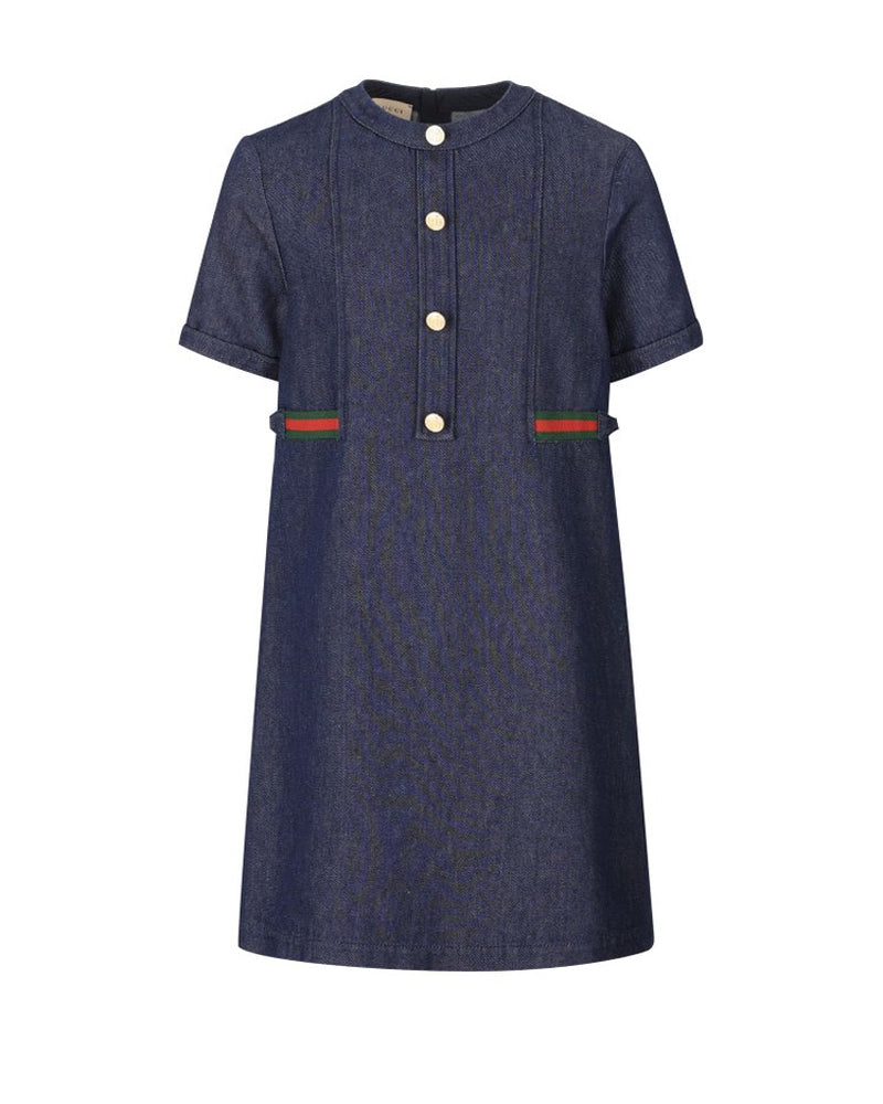 Abito in denim effetto délavé d'ispirazione vintage, girocollo, maniche corte, presenta dei luminosi bottoni oro logati, chiusura con zip sul retro e un dettaglio Web sui fianchi con l'iconico morsetto.