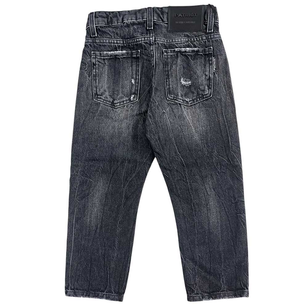 Jeans realizzati in denim nero con sfumature e rotture. Modello cinque tasche. Chiusura frontale con bottone e zip, vita regolabile grazie ad elastico interno con bottoni, passanti per cintura e label logo sul retro.