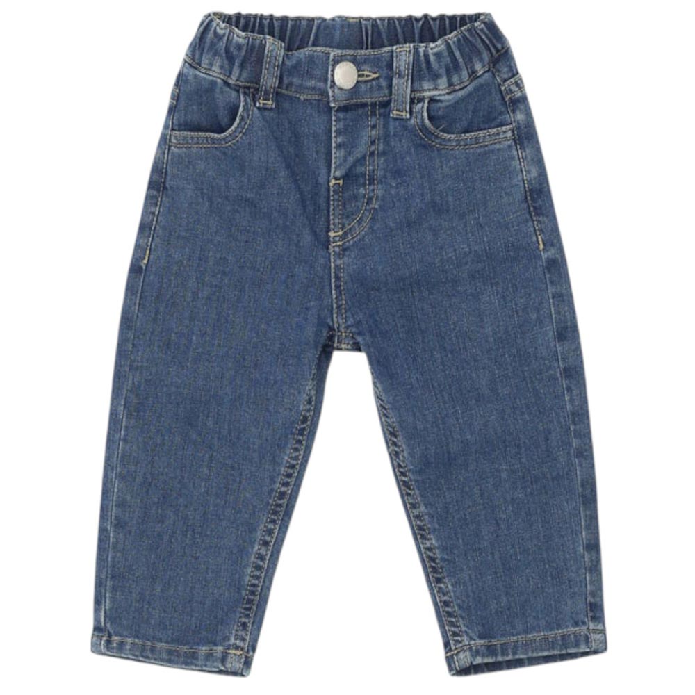 Jeans realizzati in denim di cotone, modello cinque tasche, vita elasticizzata, chiusura frontale con bottoncino a pressione.