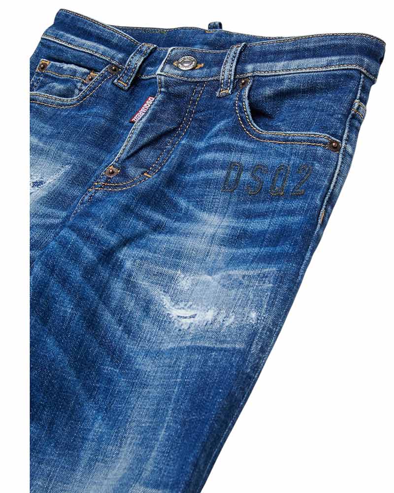 Jeans Straight Leg, realizzati in denim blu, con strappi rammendati. Modello cinque tasche. Chiusura frontale con bottoni, gamba dritta, logo bandiera Dsquared2 sulla patta e logo ricamato sul davanti.