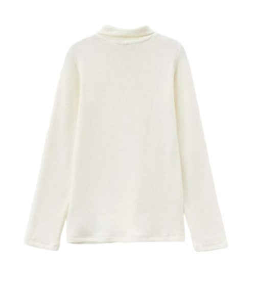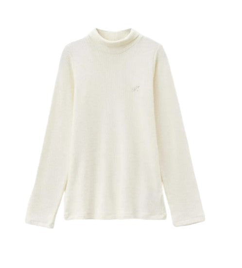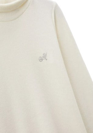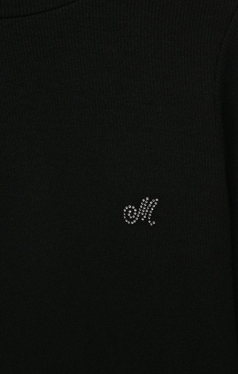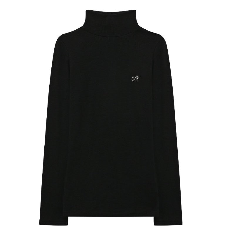 Maglia a costine a mezzo collo, manica lunga, applicazione logo in strass sul petto.