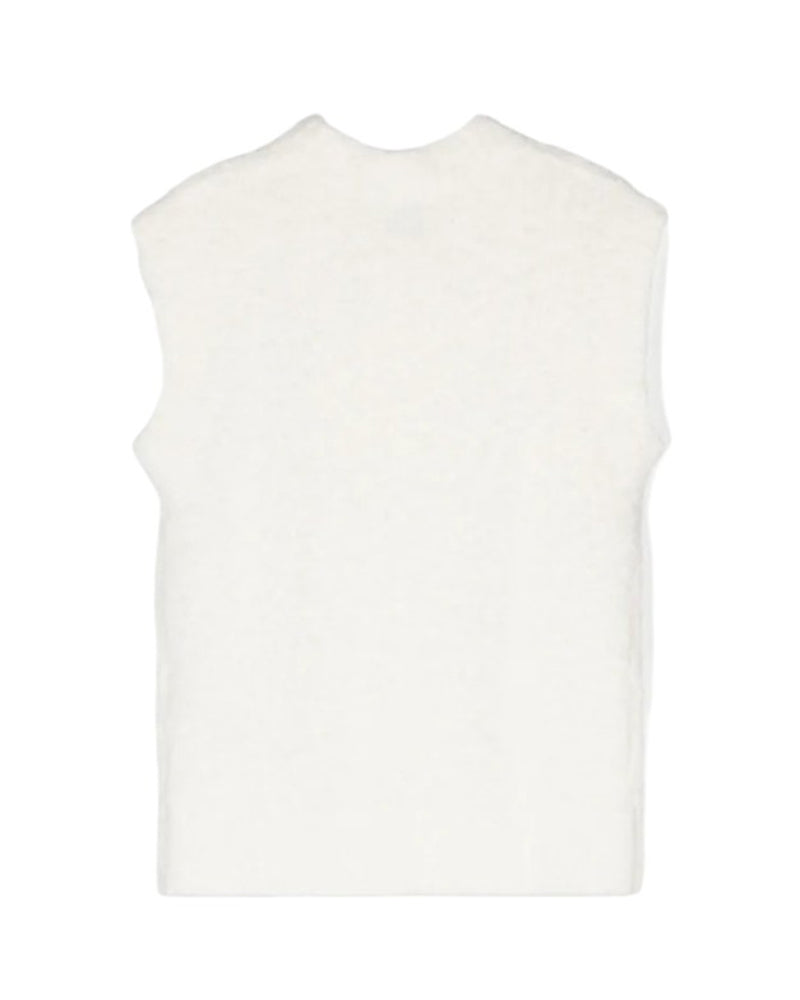 Gilet realizzato in misto lana effetto spazzolato, è caratterizzato da scollo a V, giromanica, applicazione label logo e orlo dritto.
