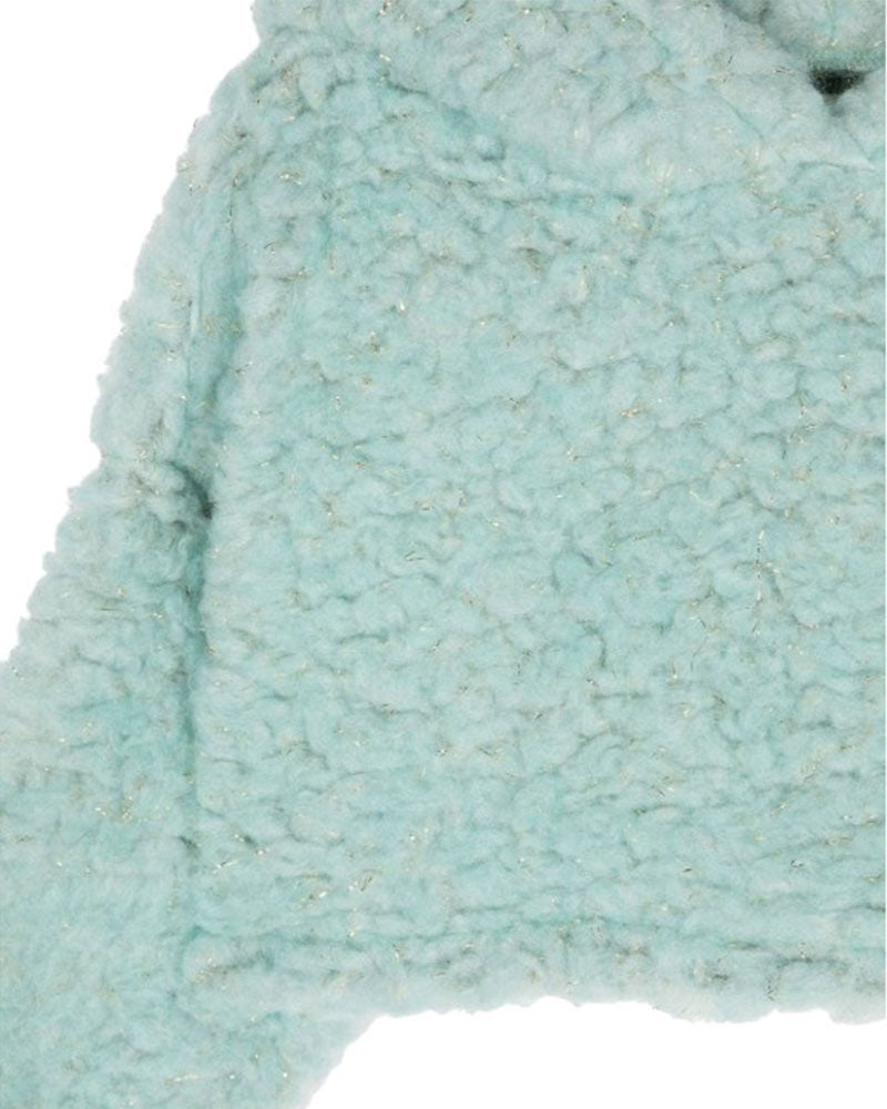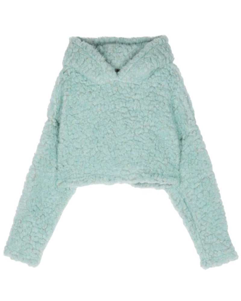 Maglia cropped con cappuccio da bambina realizzata in tessuto spazzolato con dettagli lurex e patch logo applicata sulla manica.