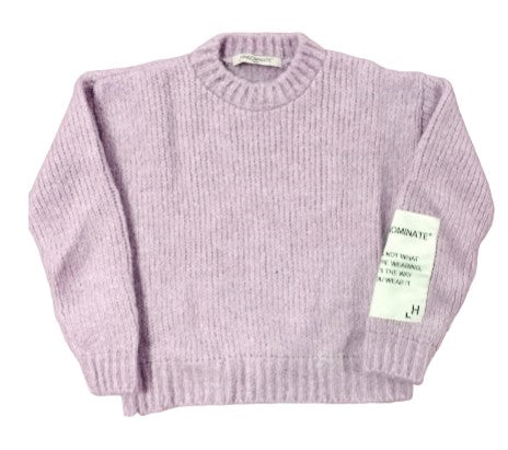 Maglia girocollo in misto lana da bambina, applicazione patch logo sulla manica, rifiniture a costa.