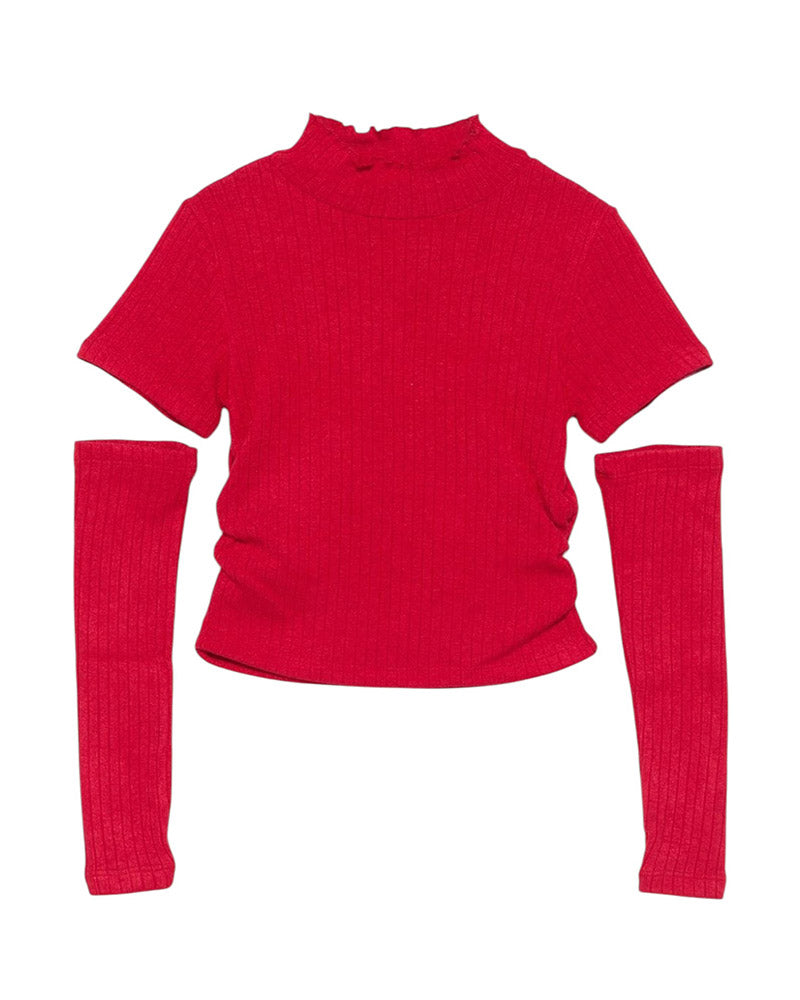 Maglia a costine da bambina. Presenta mezzo collo, maniche corte con manicotti e arricciatura ai lati.