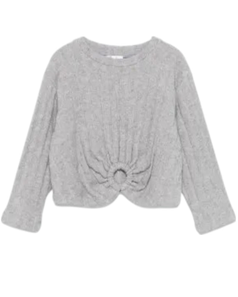 Maglia cropped a coste realizzata in misto viscosa, caratterizzata da collo tondo, maniche lunghe a 3/4 e dettaglio con l'anello sul davanti.