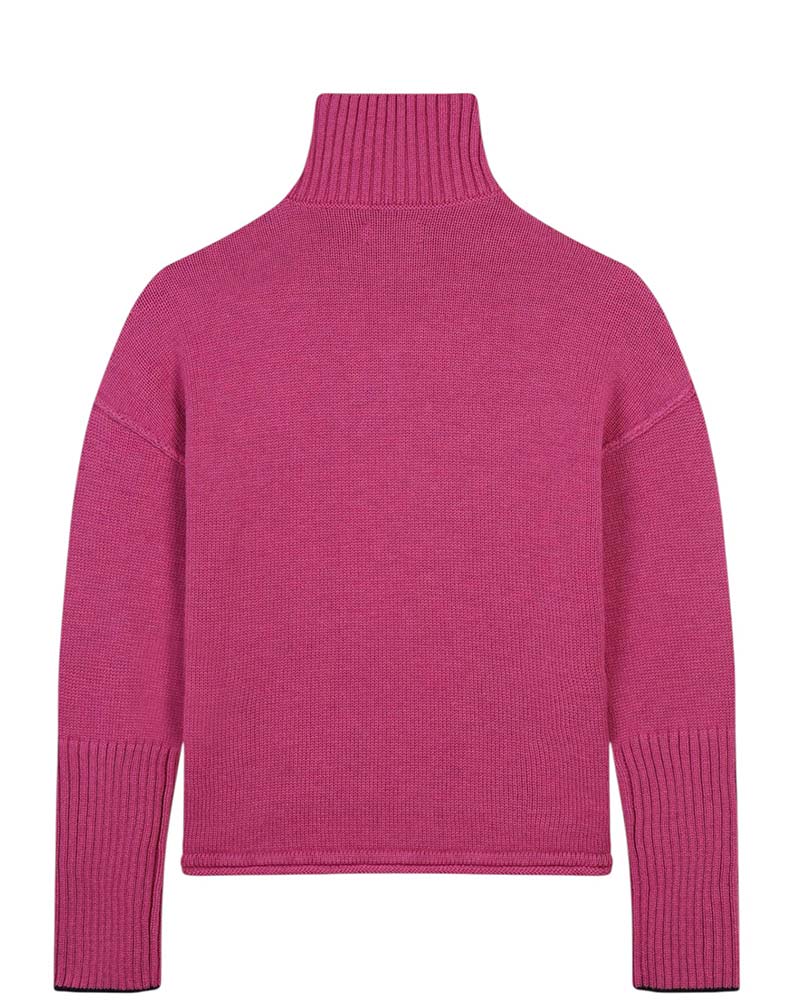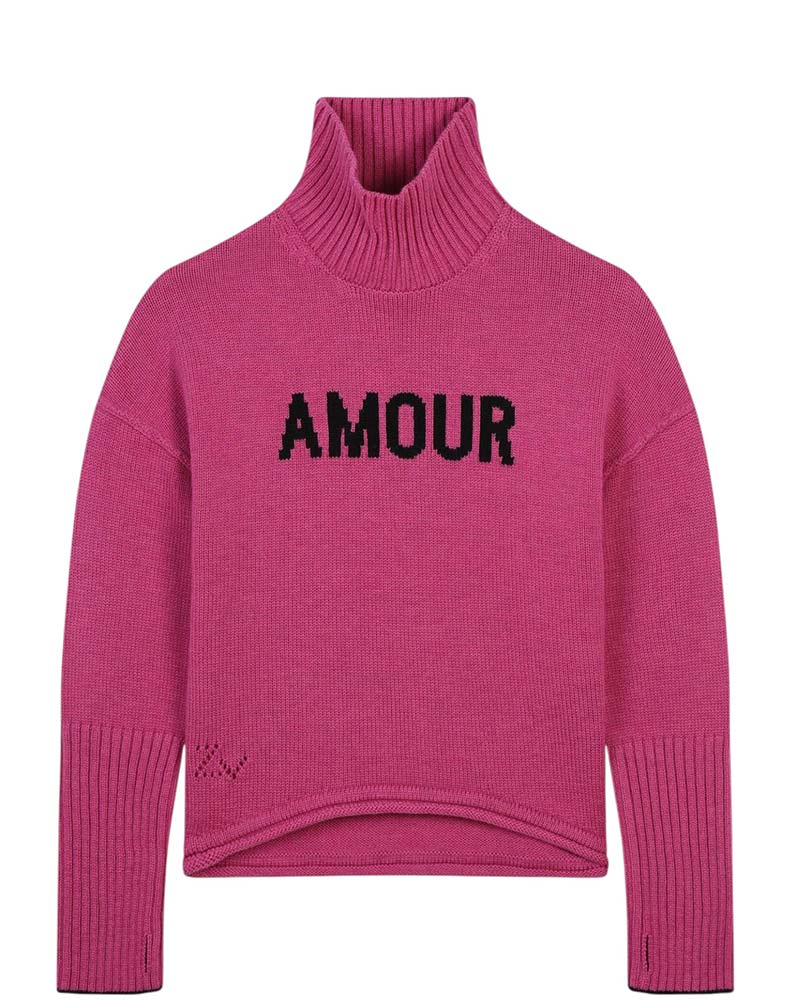 Maglia da bambina fucsia realizzata in misto lana. Presenta collo alto, spalle scese, maniche lunghe, collo e polsi a coste e orlo a taglio vivo. È decorata con scritta lettering Amour ad intarsio sulla parte anteriore.