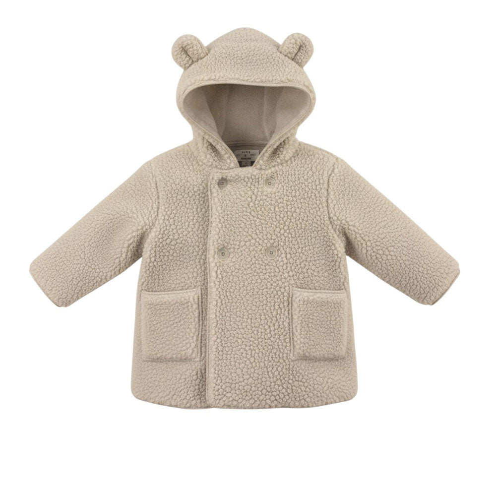 Giacca Teddy da neonato, caratterizzata da cappuccio con orecchie, chiusura frontale a doppiopetto con bottoni, maniche lunghe e due tasche applicate sul davanti.