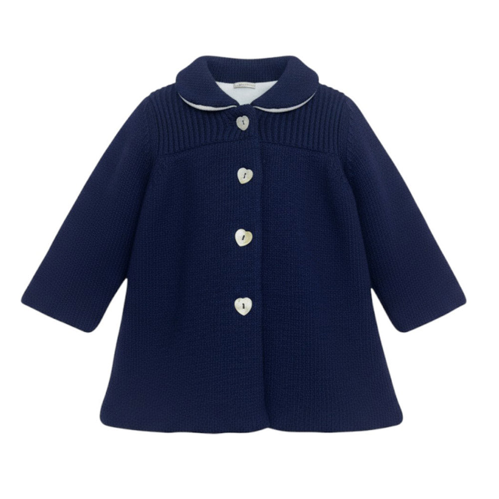 Cappotto realizzato in maglia di misto lana, caratterizzato da colletto classico, chiusura frontale con bottoni a forma di cuore, maniche lunghe, fodera in pile e orlo dritto.
