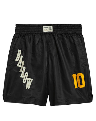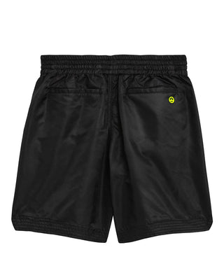 Bermuda in nylon, vita elasticizzata, due tasche laterali, motivi logati a contrasto, tasca nel retro.