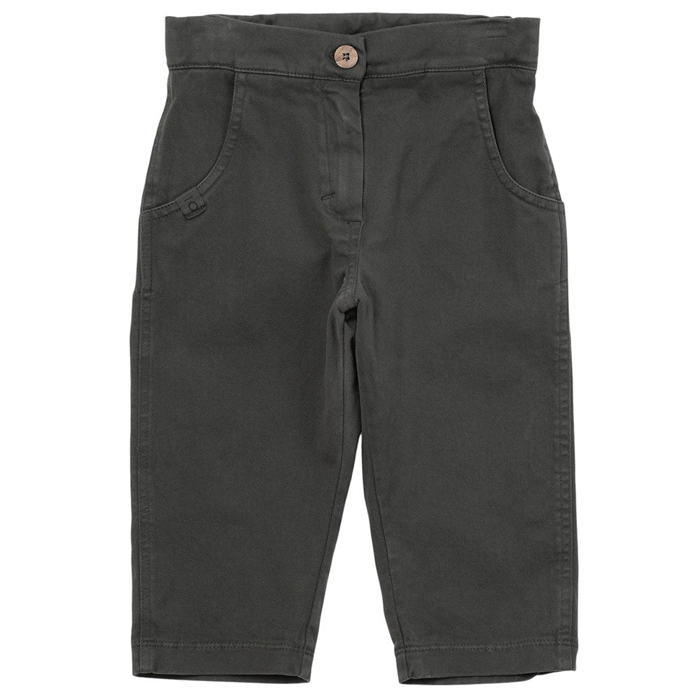 Pantaloni realizzati in twill di cotone, caratterizzati da chiusura frontale con bottone e zip, vita regolabile grazie ad elastico interno con bottoni, due tasche laterali oblique e patch logo applicata sul davanti.