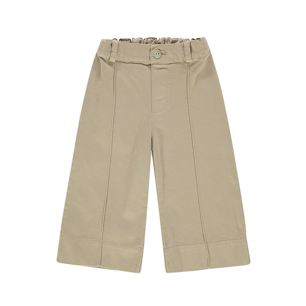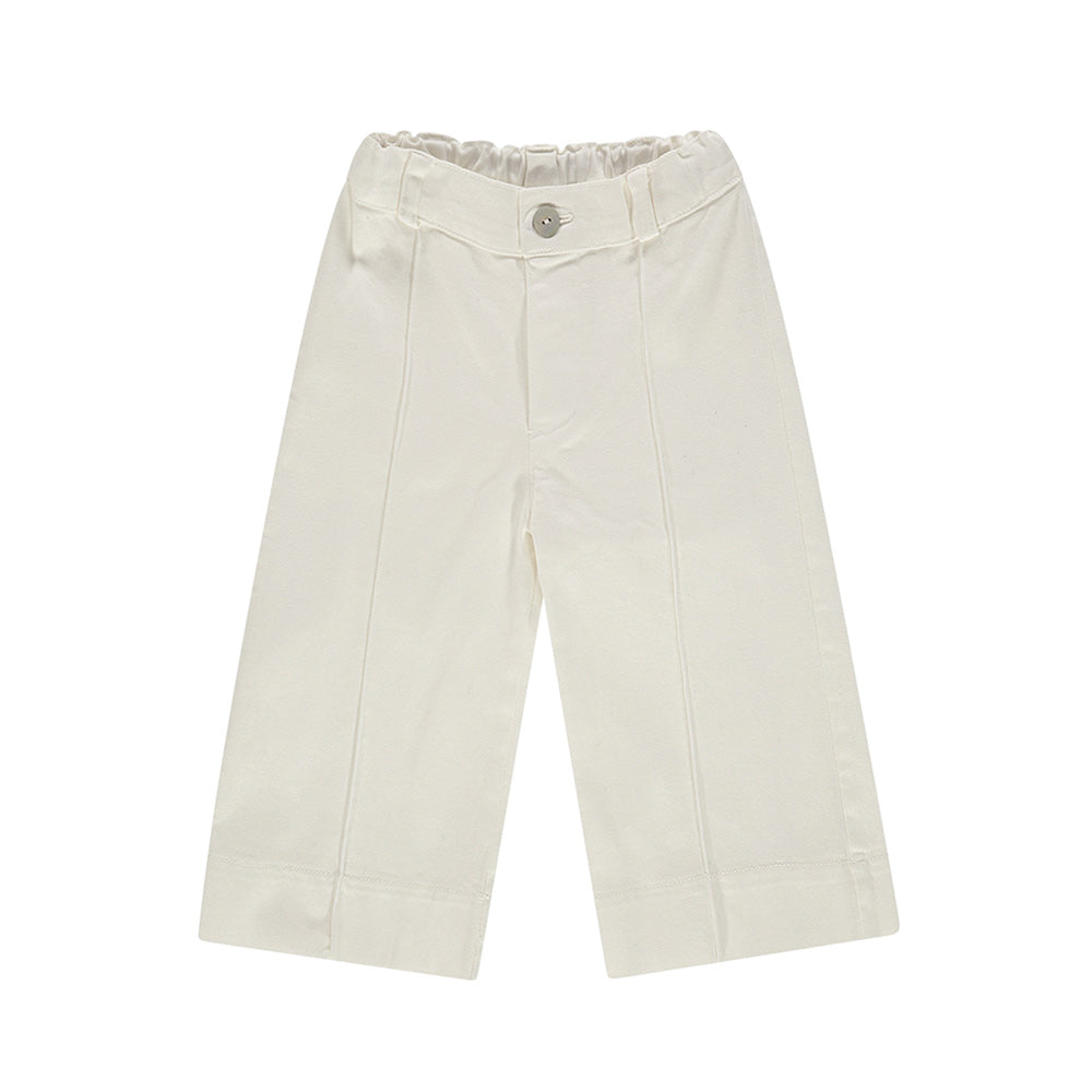 Pantaloni realizzati in cotone da neonata, caratterizzati da gamba larga con cuciture sovrapposte, vita elasticizzata sul retro, chiusura frontale con bottoncino, vita regolabile grazie ad elastico interno con bottoni.