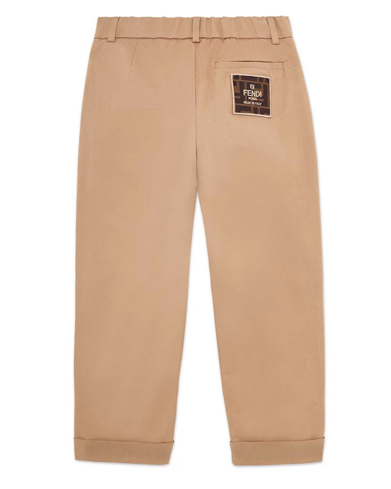 Pantaloni Fendi Kids beige con applicazioni a contrasto FF, modello dritto, passanti per cintura, applicazioni a contrasto, chiusura con bottone e cerniera.