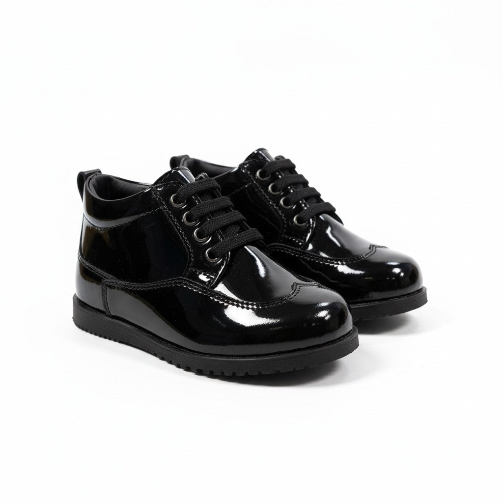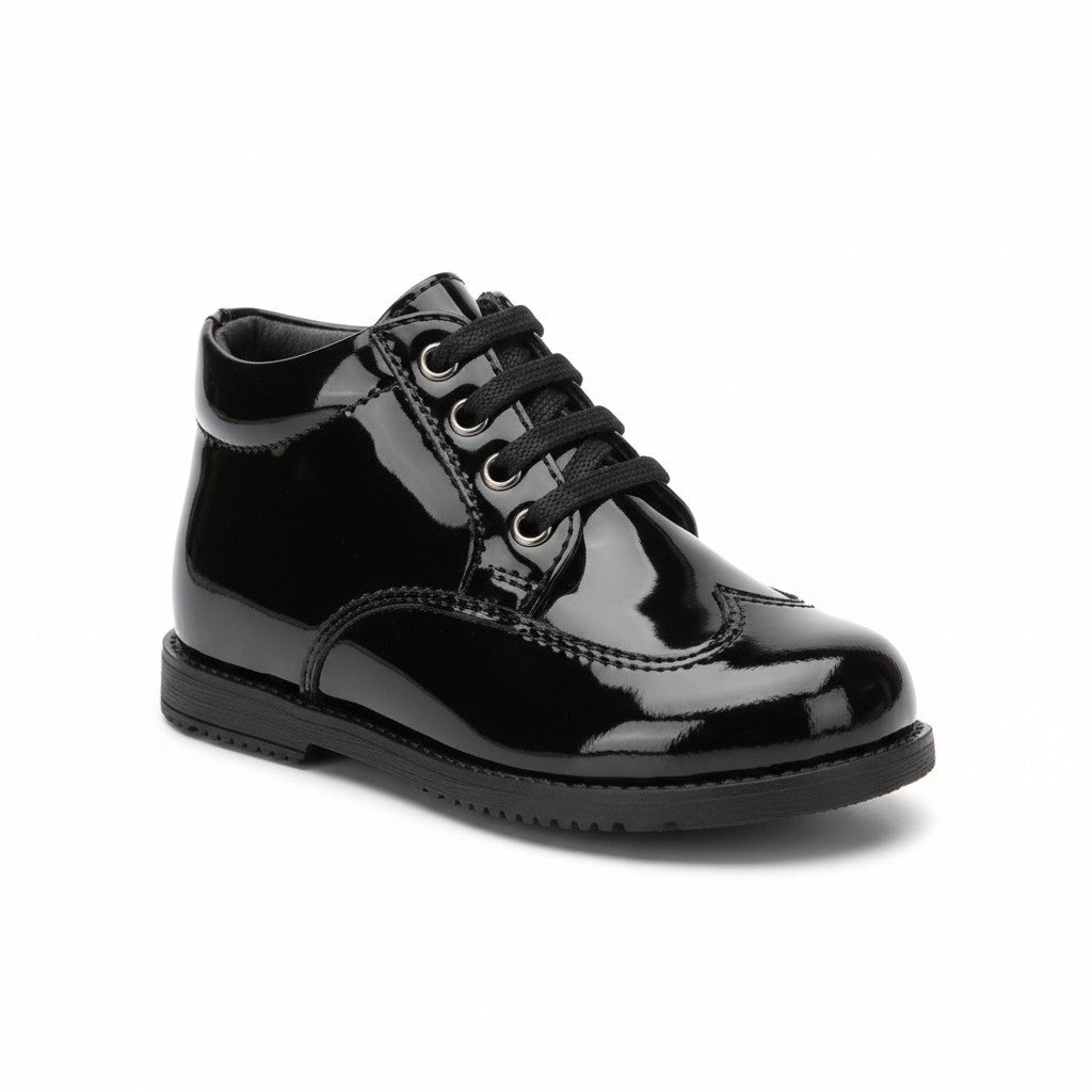 stringato in vernice nera. La tomaia è realizzata in pelle verniciata lucida, mentre la suola in gomma.