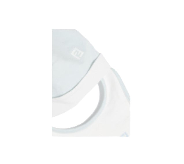 Tutina fENDI set di tre, logo ricamato in cotone elasticizzato azzurro cielo Pagliaccetto: colletto Peter Pan chiusura con bottone a pressione nascosto maniche lunghe coprigambe affusolate copripiedi berretto: motivo FF visiera risvoltata corona rotonda stile infilabile Bavaglino: motivo FF bordo rifinito bavaglino colletto stampa posteriore – orlo curvo con chiusura a bottone