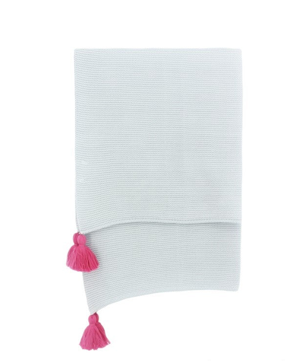 Copertina Little Bear in filo grigio con nappine ai quattro angoli in fuxia.
