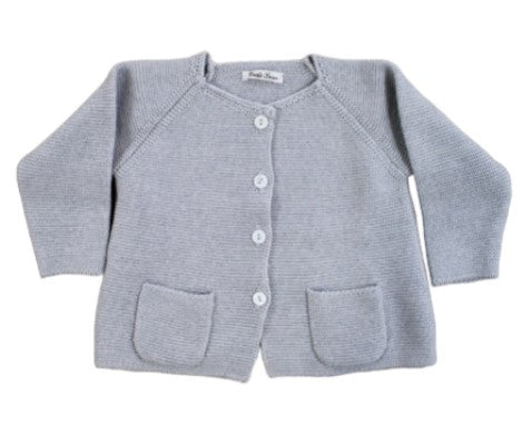 Maglia cardigan, girocollo, chiusura con bottoni, tasche applicate.