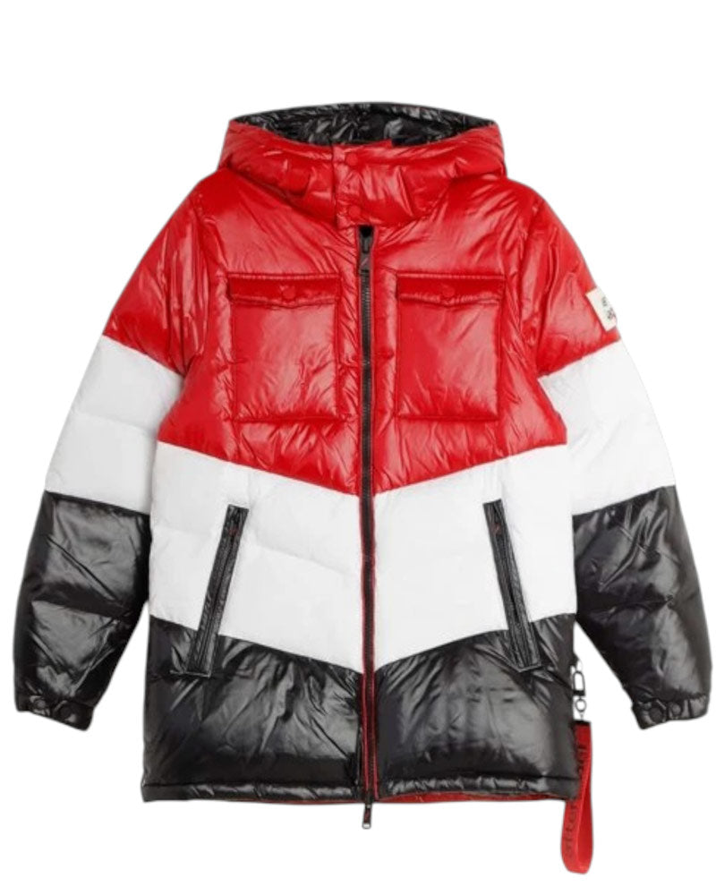 Giubbino imbottito multiclor da bambino, realizzato in nylon lucido. Presenta design trapuntato, collo alto, cappuccio fisso, chiusura frontale con zip, maniche lunghe con polsi elasticizzati, due tasche a filetto, due tasche con patta applicate sul davanti e orlo dritto. È decorato con patch logo applicata sulla manica.
