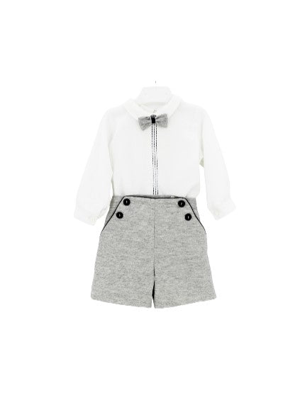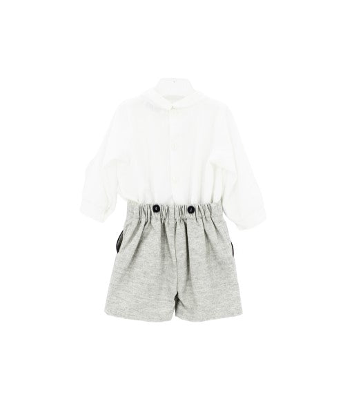 Completo Ponto Por Ponto composto da camicina in franella con fasce ricamate blu e pantaloni con papilon in gabardine. La camicia è legata ai pantaloni con bottoni a scomparsa.