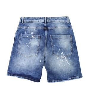 Bermuda in denim con schizzi in pittura bianca, modello cinque tasche, chiusura forntale con bottoni, tasche applicate sul retro.