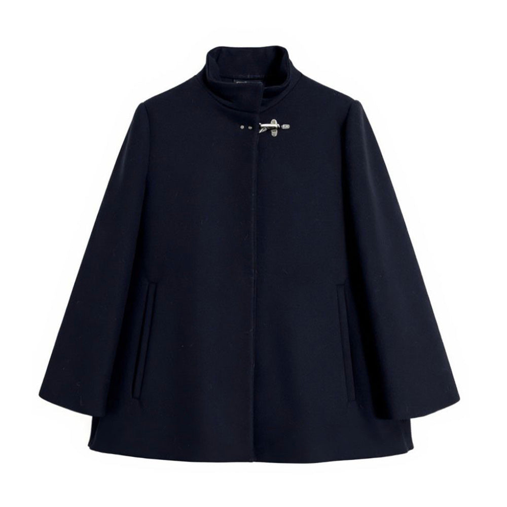 Cappa realizzata in misto lana, caratterizzata da collo alto, chiusura frontale con gancio e bottoni a pressione, maniche lunghe, due tasche laterali a filetto e orlo svasato.