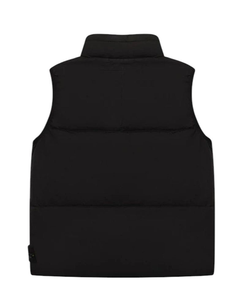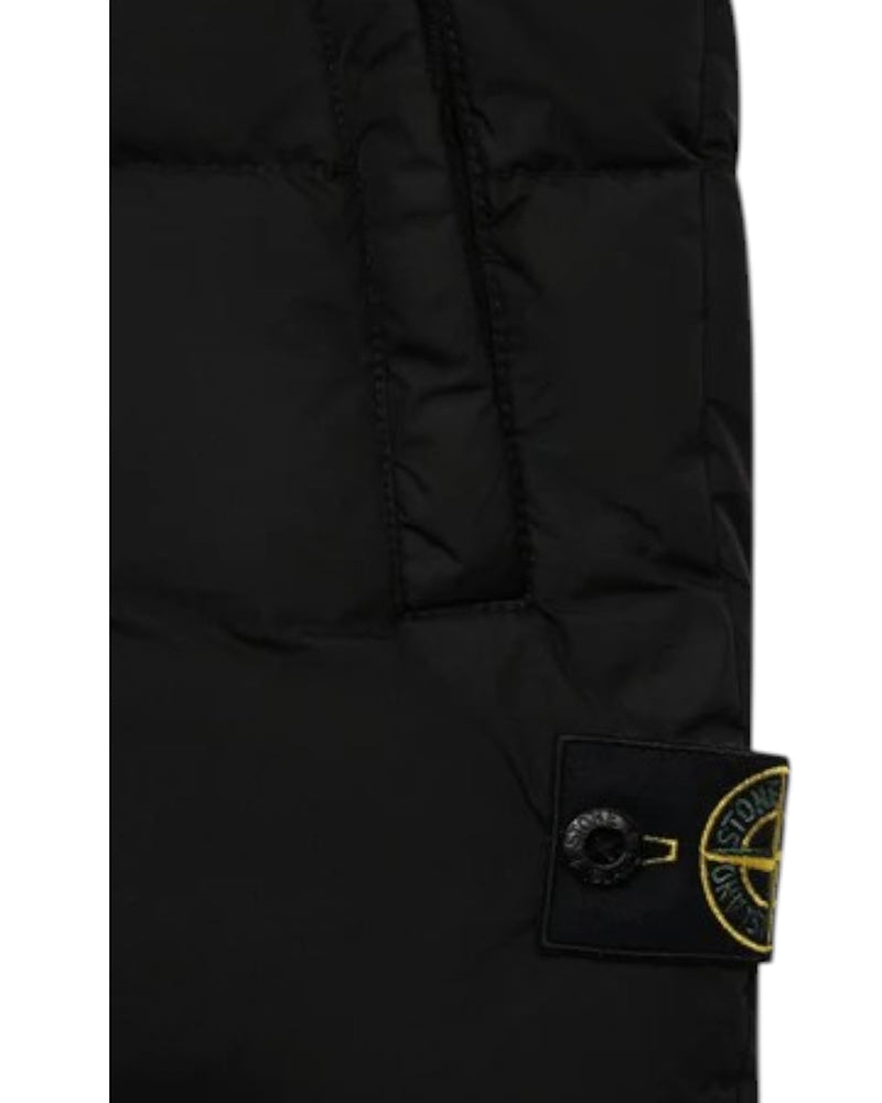 Smanicato imbottito da bambino, realizzato in poliammide. Presenta design trapuntato, collo alto, cappuccio estraibile, chiusura frontale con zip, una tasca a filetto sul davanti e due tasche a filetto laterali. È decorato con applicazione laterale di Badge Stone Island.