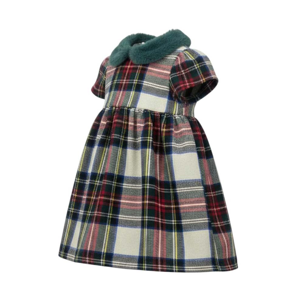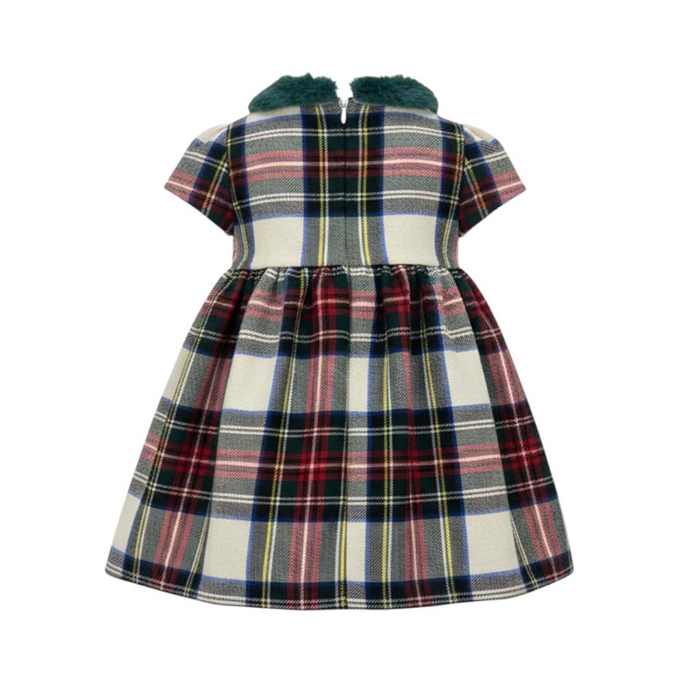 Vestina da neonata dal taglio a impero, realizzata in tessuto misto lana intarsiato con filato lurex in fantasia Tartan. Presenta colletto alla Peter Pan in pelliccia ecologica, maniche corte a sbuffo, gonna voluminosa con fodera interna con balza in tulle e chiusura con zip nascosta sul retro.